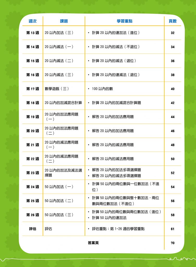 小學第一學習階段(小一至小三),數學課程由「數」、「度量」、「圖形與空間」及「數據處理」。《26 週小一入學前系列:數學科重點預習》配合最新小學數學課程, 提供豐富內容及重點學習策略,協助家長教導幼兒基礎概念,建立思維及解題能力,為升讀小學作最佳準備。